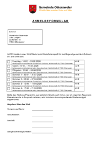 ANMELDEFORMULAR Zurück an: Gemeinde Ottersweier Julia Lempert Laufer Str. 18 77833 Ottersweier Ich/Wir melden unser Kind/Kinder zum Kinderferienspaß für nachfolgend genannten Zeitraum an: (Bitte…